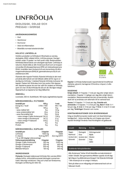 HolisticKallpressad linfröolja är en källa till omega-3. Den här är dessutom odlad och pressad i Sverige, från KRAV-odlade linfrön. Kallpressad linfröolja ...