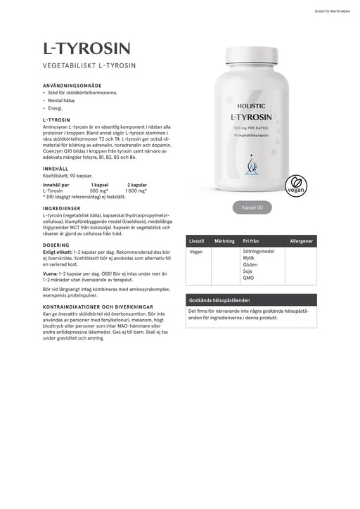 Holistic L-tyrosin innehåller 90 kapslar med aminosyran l-tyrosin, en viktig komponent i nästan alla proteiner i kroppen. Holistic L-tyrosin innehå...