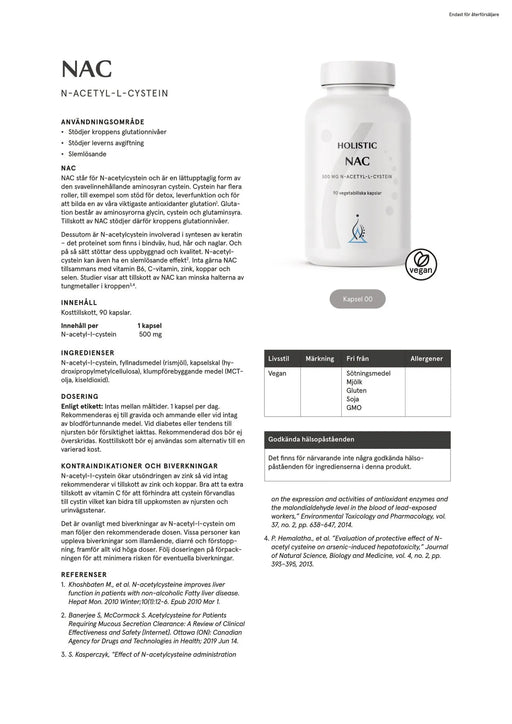 Holistic NAC innehåller 500 mg/kapsel av den svavelinnehållande aminosyran cystein. Cystein behövs i kroppen för att kunna bilda glutation. Tillsko...