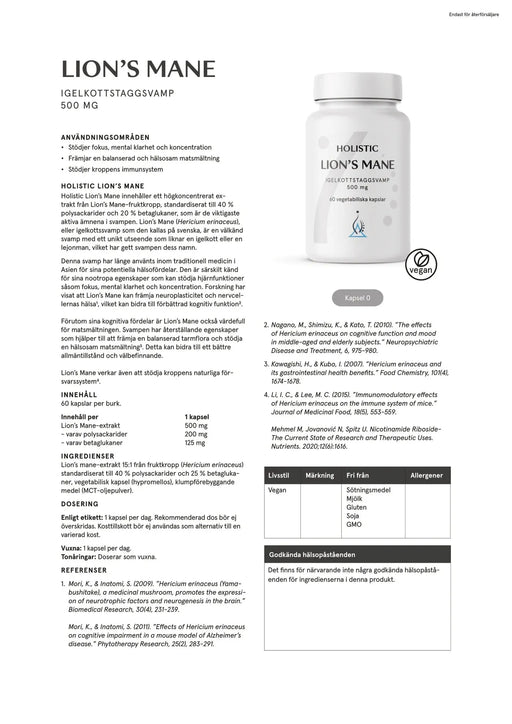 Holistic Lion’s mane är ett tillskott med en imponerande halt av de aktiva ämnena polysackarider och betaglukaner.✓ För kognitiv funktion - fokus, ...