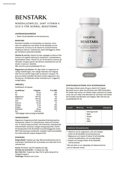 HolisticNoga utvald blandning av mineraler, spårämnen och vitamin K2 och D3 för en normal benstomme. Noga utvald blandning där vitamin K och D, liksom mine...