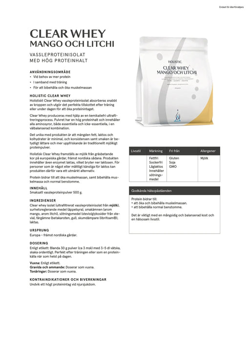 Visa alla detaljerHolistic Clear Whey vassleproteinisolat mango och litchi, 500g