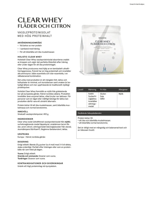 Visa alla detaljerHolistic Clear Whey vassleproteinisolat fläder och citron, 400g